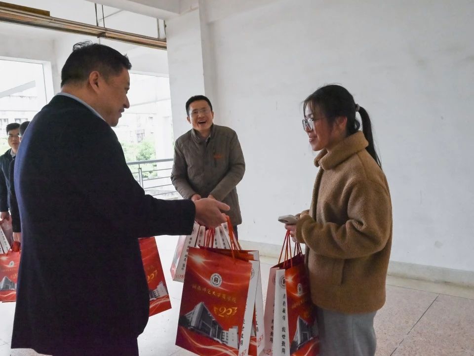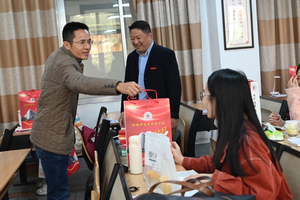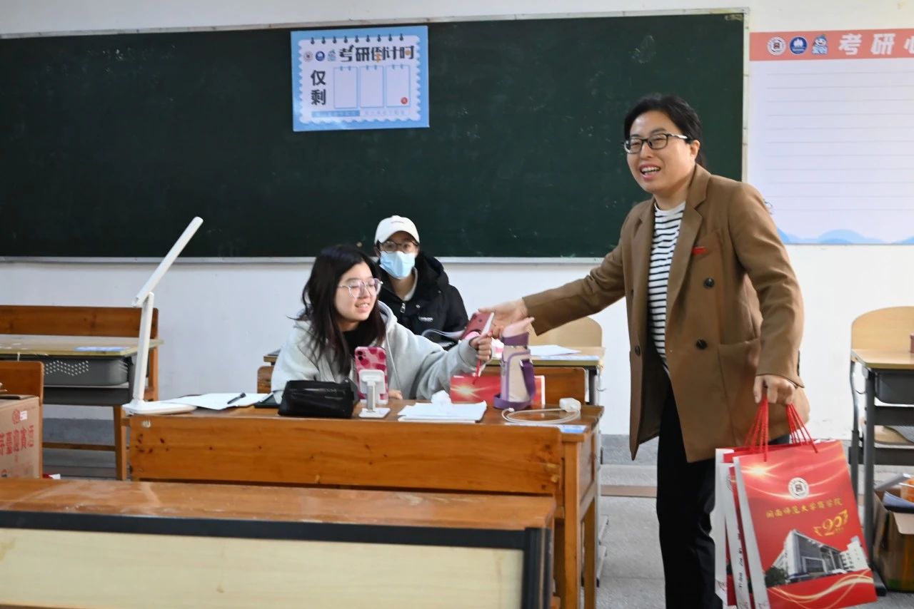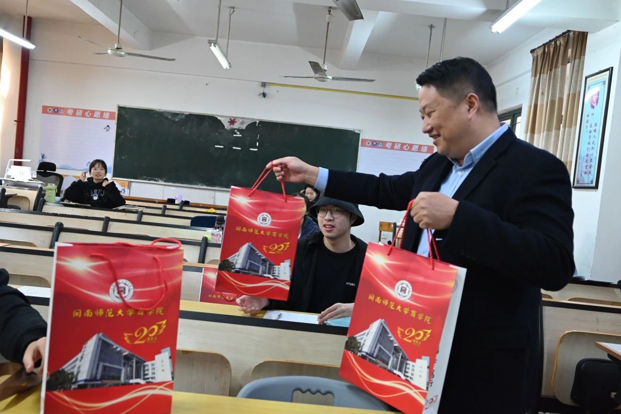 2024年硕士研究生考试即将到来,为帮助考研学子们稳心态、增信心、添动力,减缓焦虑与压力,做好备考最后的冲刺,12月18日,永利23411集团开展为考研学子发放礼包活动,为即将考研的同学送去暖心的鼓励与美好的祝福。在这个特别的时刻,学院用内容丰富、寓意美好的礼包为考研学子们送上成功上岸的美好祝愿。永利23411集团老师们走进教室,倾听考研学子的心声,与考研学子们亲切交谈,表达对他们的美好祝福,鼓励学子们要有信心、有毅力、有恒心,相信自己,相信未来的美好,全力以赴、奋战到底。活动现场气氛热烈,这些礼包让考研学子们倍感温暖。在最后的冲刺阶段,这些关爱如一缕暖阳,为考研学子送去冬日的温暖,帮助他们放松身心,缓解紧张情绪。
