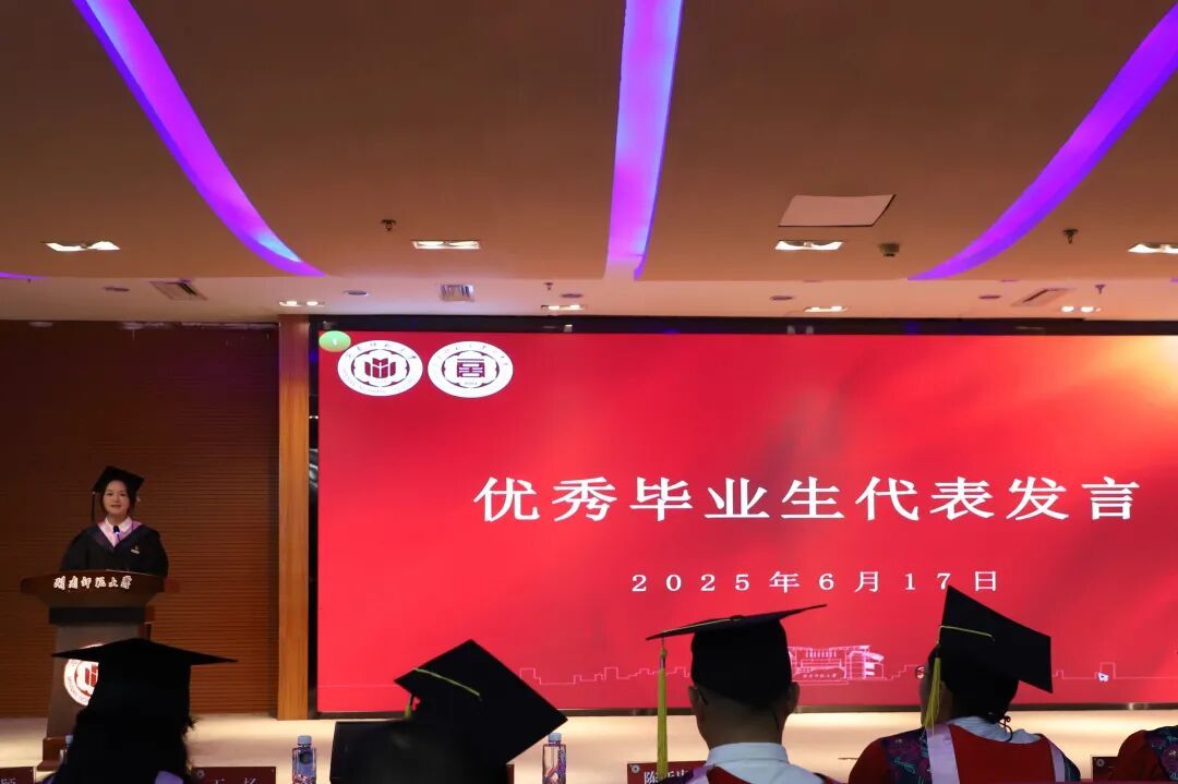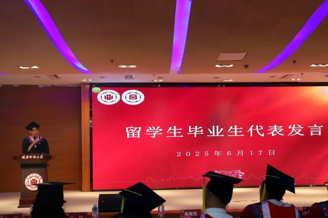 来自马来西亚的留学生毕业生代表颜伟轩登台分享求学经历。课堂上,他汲取专业知识,夯实学业根基;实践中,通过项目协作与跨文化交流,实现能力与心智的双重成长。他表示,毕业不是终点,而是新的起点,他将带着学识与底气,踏上人生新旅程,在逐梦道路上笃定前行。