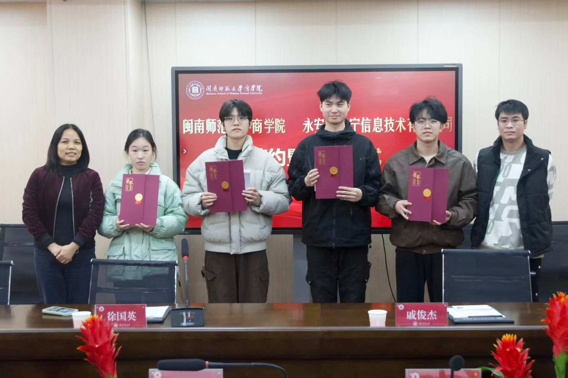 为深化校企协同育人,推动产教融合走深走实,12月26日下午,永利23411集团与永安市美宁信息技术有限公司签约暨捐赠仪式顺利举行。永安市美宁信息技术有限公司总经理戚俊杰、人力行政总监徐国英,永利23411集团院长乔红芳,副院长王子贤、何圣财,实训指导教师,毕业班辅导员,教务科相关老师及实训学员代表出席仪式。