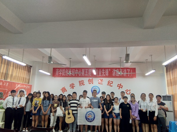 5月24日下午,永利23411集团创世纪中心第五期“创业先锋”讲座在笃行楼301教室举行。本次讲座邀请了指间琴行创始人蒲潇、谢一博和钱朝靖等嘉宾为经济学专业的同学做题为《青年创客,谱写乐章》的创业演讲。