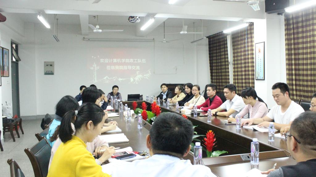 11月19日下午,计算机学院党委书记陈志宏、副书记蔡滨带领全体政工队伍到我院笃行楼216会议室进行访问交流,永利23411集团党委书记黄伟东、副书记王中坚及全体辅导员参加了会议。会议由王中坚副书记主持。