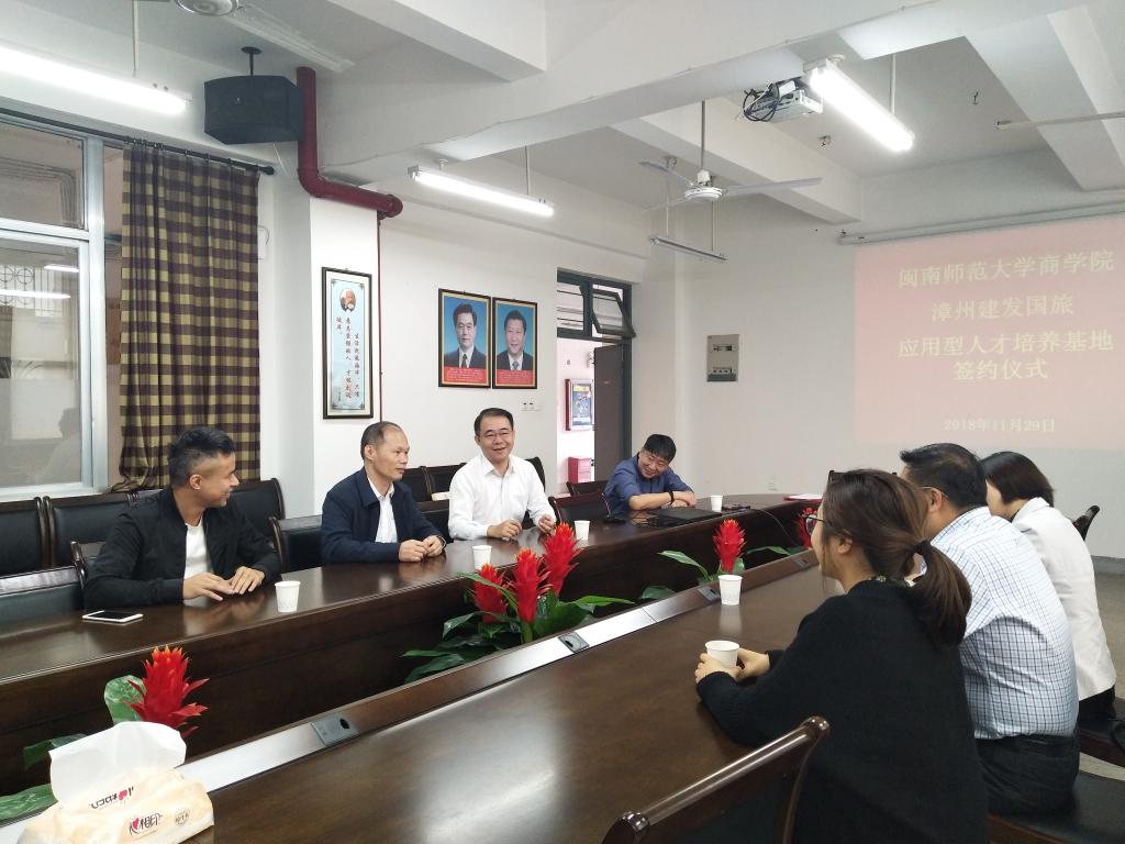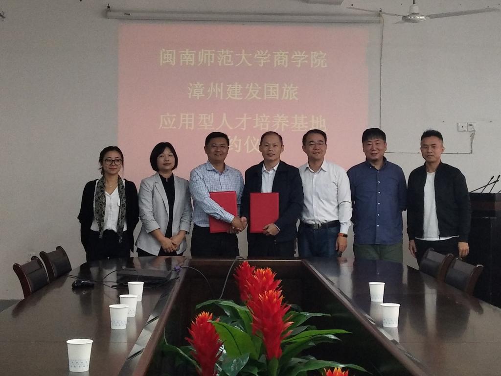签约仪式前,钟总经理介绍了漳州建发国旅目前的运营状况,展望了国旅的发展前景并肯定了我校旅游管理专业前期为该公司输送的优质人才。黄伟东书记和旅游管理系主任陈斯胄老师简要介绍了旅游管理专业的发展历程、师资构成及专业特色。双方在探索校企合作新路径、学生实习(实训)新方法等方面达成了共识。最后,由黄伟东书记与钟海鹰总经理共同签署了《应用型人才培养基地共建协议书》并合影留念。