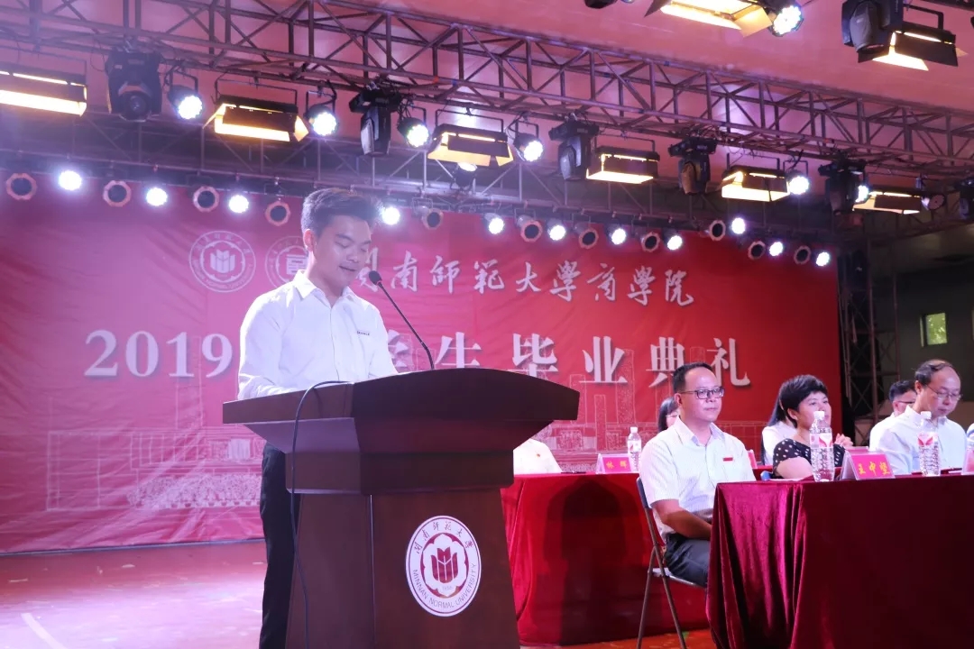 16级经济学2班的何明波同学作为在校生代表发言。他希望15级学长学姐们能铭记在永利23411集团这四年的成长和收获,将永利23411集团的精神内化为一生的财富,成为未来走向人生巅峰的强大动力。