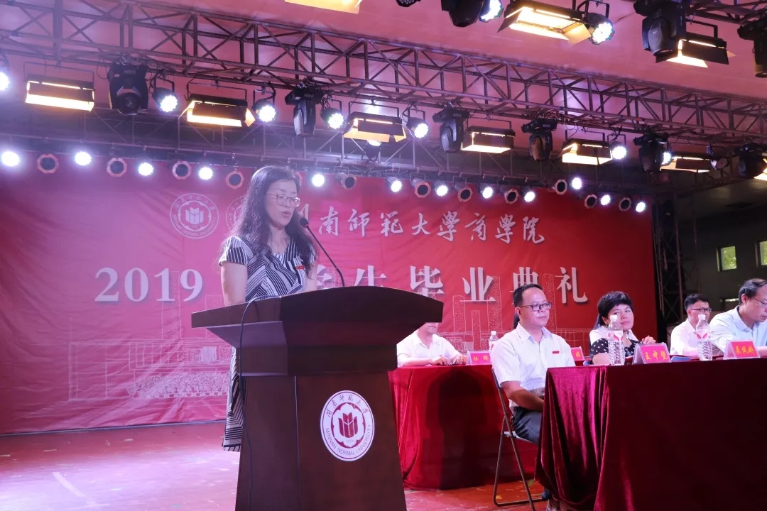 教师代表乔红芳副教授向2019届毕业生的顺利毕业表示祝贺,她引用习近平总书记的话语,希望同学们能够敢于担当、勇于奋斗,并心怀感恩、温暖从容,在未来的路上坚守梦想,无问西东。