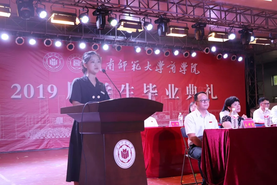 15级金融1班的优秀毕业生代表陈妙君同学发表毕业感言。她回顾了大学四年的生活,表达了对母校和老师辛勤培育的感激之情,深情道出毕业临别时的种种不舍。她号召大家作为新时代的新青年,要不负习总书记的厚望,担当时代责任,勇立时代潮头,争做时代先锋。