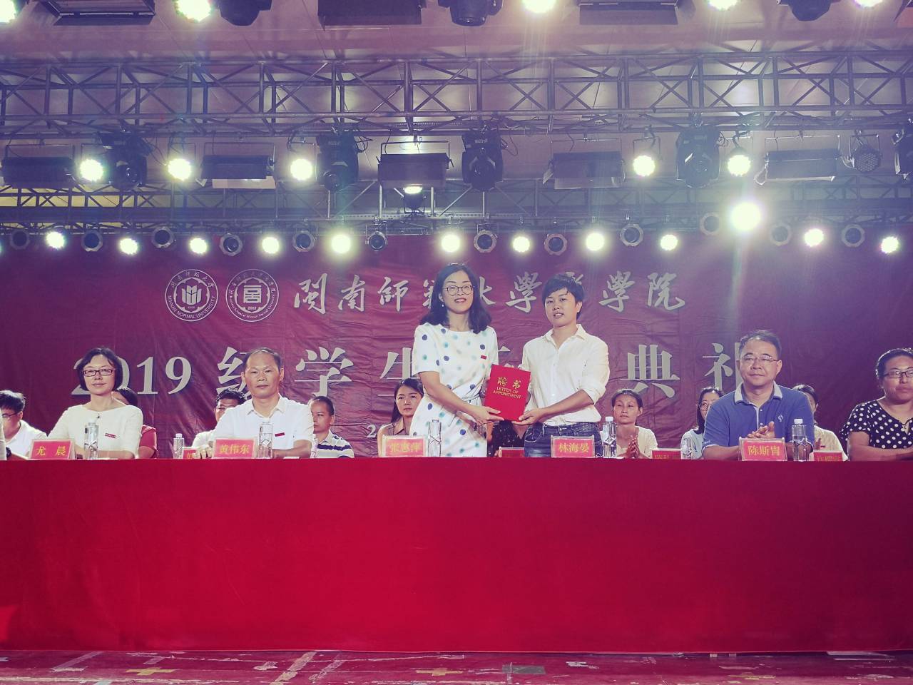 校徽是学校精神文化的象征,也是闽师大学子身份的象征,同时它还代表着一份责任,代表着学生与学校的未来。典礼上,学院党政领导和老师为新生代表佩戴校徽。