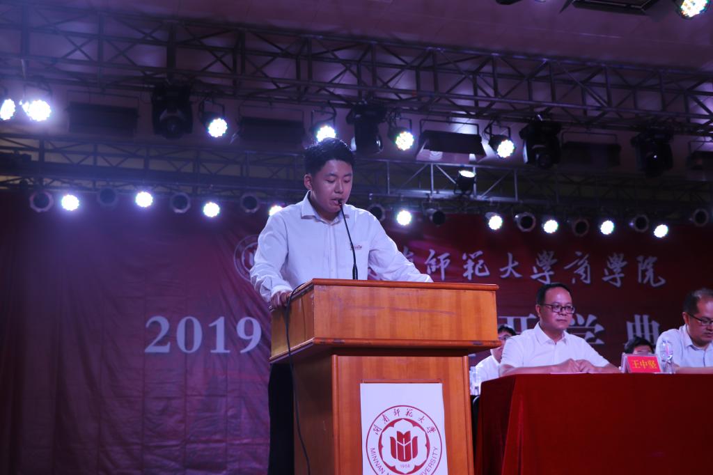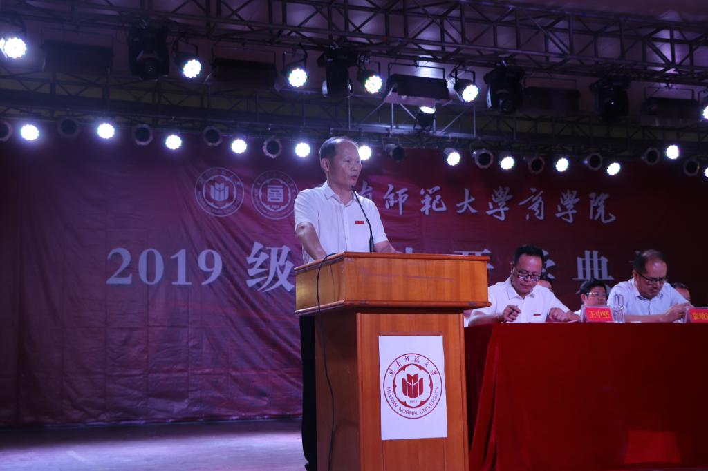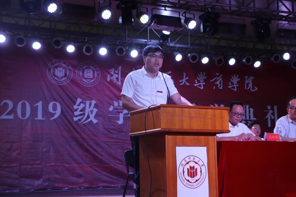 伴随着嘹亮的国歌声,19级新生开学典礼拉开了帷幕。首先由院党委书记黄伟东致辞,他代表全院师生员工向永利23411集团19级新生表达了热烈欢迎。在致辞中,他激励新生们要努力成为一名优秀的商院人,首先需要有一份同祖国共进退的爱国情,其次要有一种敢拼会赢的拼搏劲,最后要有一颗知恩图报的感恩心。他强调新生们要树立远大的志向,要有浓重的家园情怀,要增强自己的责任担当。他希望新生们在永利23411集团这方天地中释放潜力,追寻梦想,不负韶华,不负时代。