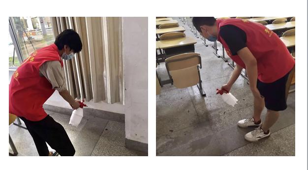 乐于奉献的志愿者正在教室里打扫卫生并消杀,以便为大家提供一个清爽健康的环境。