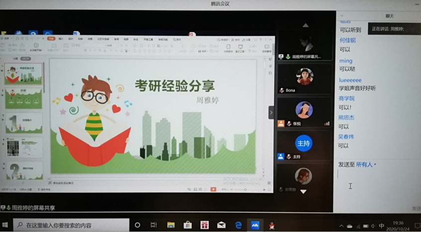 为帮助我院同学更好地了解考研形势,明确考研规划,调整复习方法,提前营造良好的考研氛围,增强考研斗志。10月24日晚,我院在腾讯会议平台举办秋季线上考研交流会。本次考研交流会邀请到了周雅婷、蔡玲洁、张伟达三位优秀考研学姐学长来给同学们分享经验。