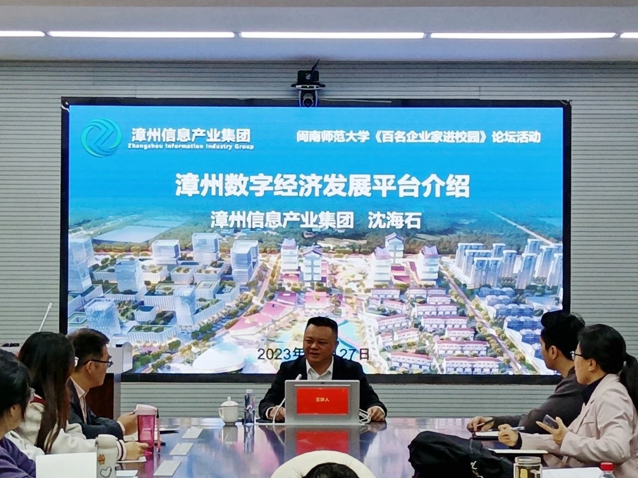 为加强我院专业建设力度,提升校企合作建设水平,加快校企合作协同育人步伐,11月27日下午,永利23411集团邀请漳州信息产业集团党委书记、董事长沈海石来我院开展《百名企业家进校园》论坛活动,副院长(主持工作)乔红芳、副院长王子贤、院长助理陈加民、经济与贸易系主任沈华福及数字经济专业部分师生参加本次论坛,论坛由副院长王子贤主持。