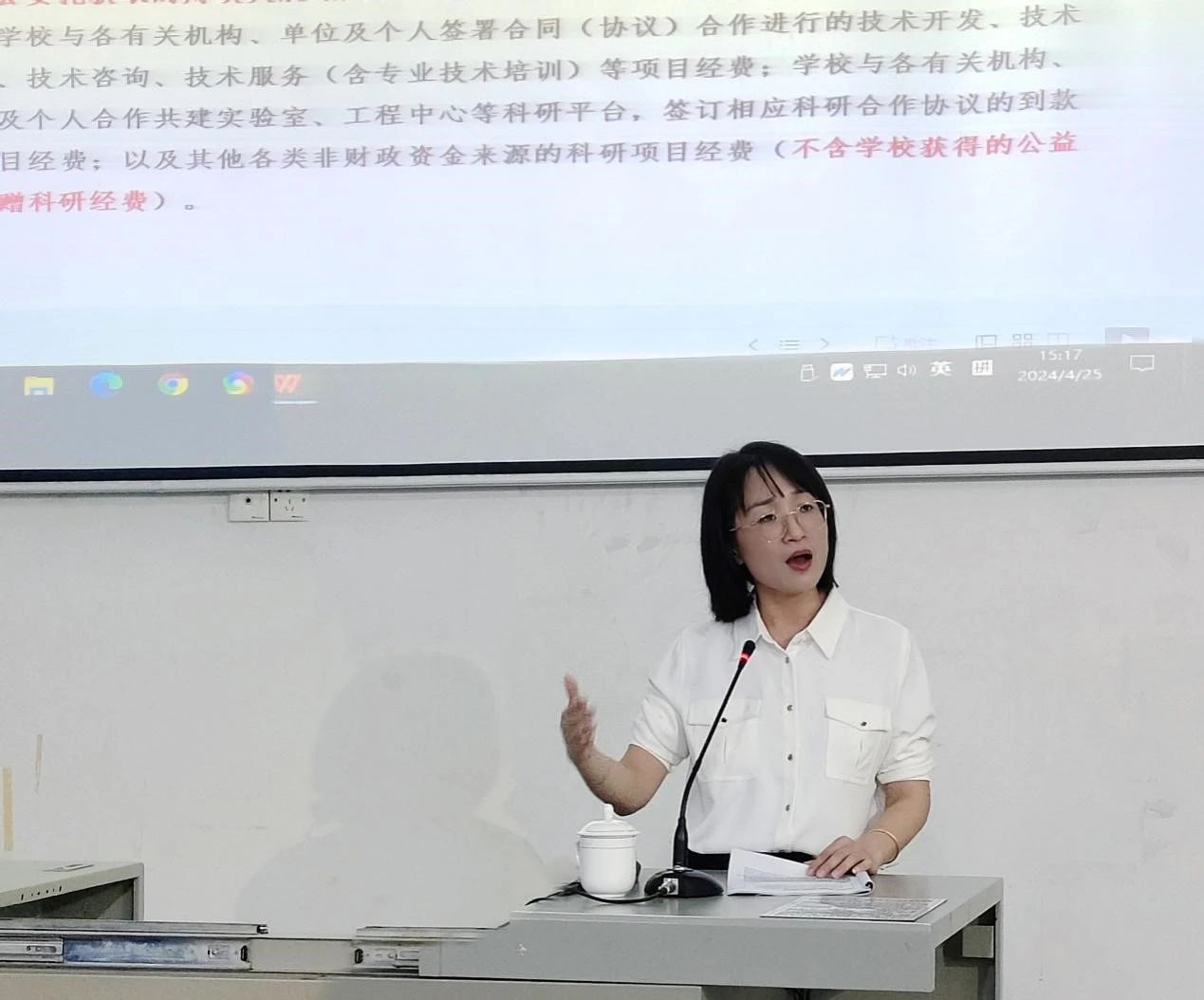 潘小焮科长简要介绍了科研处的组织架构与职能分工情况,并就《yL23411永利集团纵向科研经费管理办法》《yL23411永利集团横向科研项目经费管理办法》《yL23411永利集团科研项目级别认定办法(修订)》《yL23411永利集团学术著作出版专项经费管理暂行办法》《yL23411永利集团创新平台建设与管理办法》等10余份最新科研政策文件进行专业、细致、到位的解读,助力学院教师学好政策,用好政策,提高科研工作科学性与规范性。