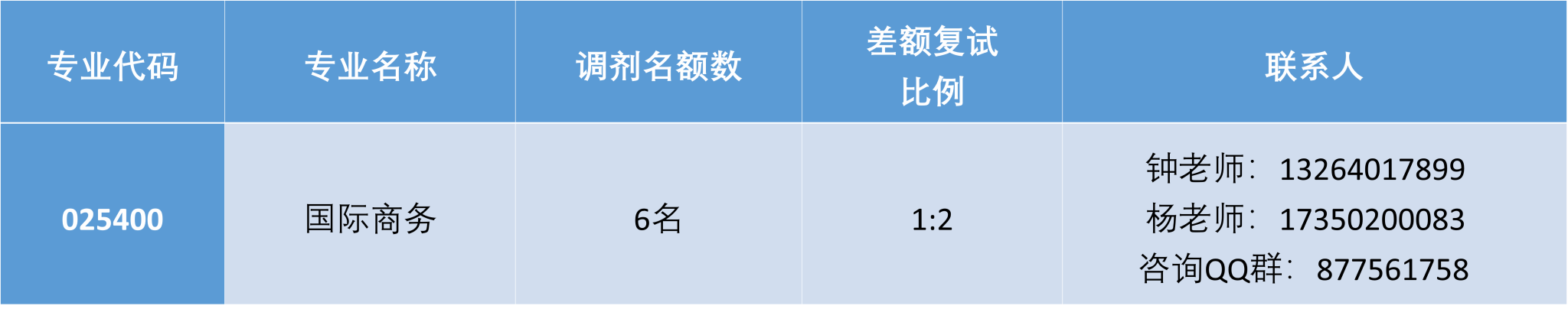 5. 申请国际商务专业的调剂考生,第一志愿报考专业须属经济学门类,学科代码前两位为“02”,具体包括:0201理论经济学、0202应用经济学、0251金融、0252应用统计、0253税务、0254国际商务、0255保险、0256资产评估、0258数字经济、0270统计学、0271区域国别学。