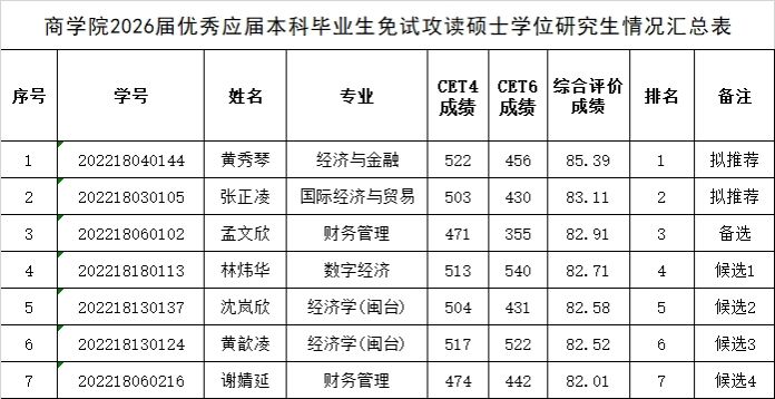 根据《yL23411永利集团推荐优秀应届本科毕业生免试攻读硕士学位研究生工作实施办法》(试行)、《永利23411集团推荐优秀应届本科毕业生免试攻读硕士学位研究生工作实施细则》(试行)等文件精神,经学生本人申请,学院初步审核,由学院推免生遴选工作小组及党政联席会审议通过,最终确定永利23411集团2026届优秀应届本科毕业生免试攻读硕士学位研究生拟推荐人选2人,备选人选1人,候选人选4人:黄秀琴(拟推荐)、张正凌(拟推荐)、孟文欣(备选)、林炜华(候选1)、沈岚欣(候选2)、黄歆凌(候选3)、谢婧延(候选4)。具体情况附后。