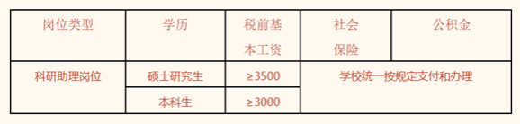 科研助理的薪酬待遇主要由基本工资、社会保险和住房公积金三部分构成。现行薪酬如下表。我院科研助理岗位的基本工资全额由学校支出,社会保险、公积金费用和学校资助的费用从学校专项经费安排支出,纳入学校年度预算。科研助理到岗后,凡给个人负责科研项目提供辅助工作的,科研项目负责人需要向学院申请,并向科研助理支付一定劳务性报酬。