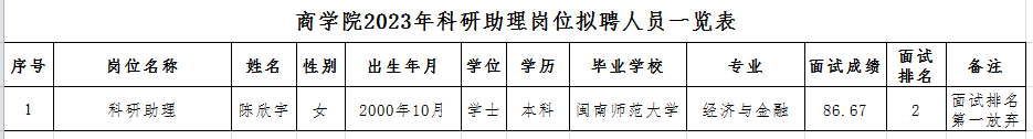 永利23411集团关于科研助理岗位拟聘人员的公示根据《永利23411集团面向应届毕业生招聘科研助理工作人员公告》,经学院党政联席会研究,以下人员已通过面试,体检合格,确定为拟聘用人员,现予以公示。公示时间:2023年6月28日至7月6日(7个工作日),公示期间如有异议,请来函来电。凡以匿名或其他方式或超过公示期反映的问题不予受理。联系人:帅老师,联系电话:2527161,电子邮箱:298104252@qq.com。