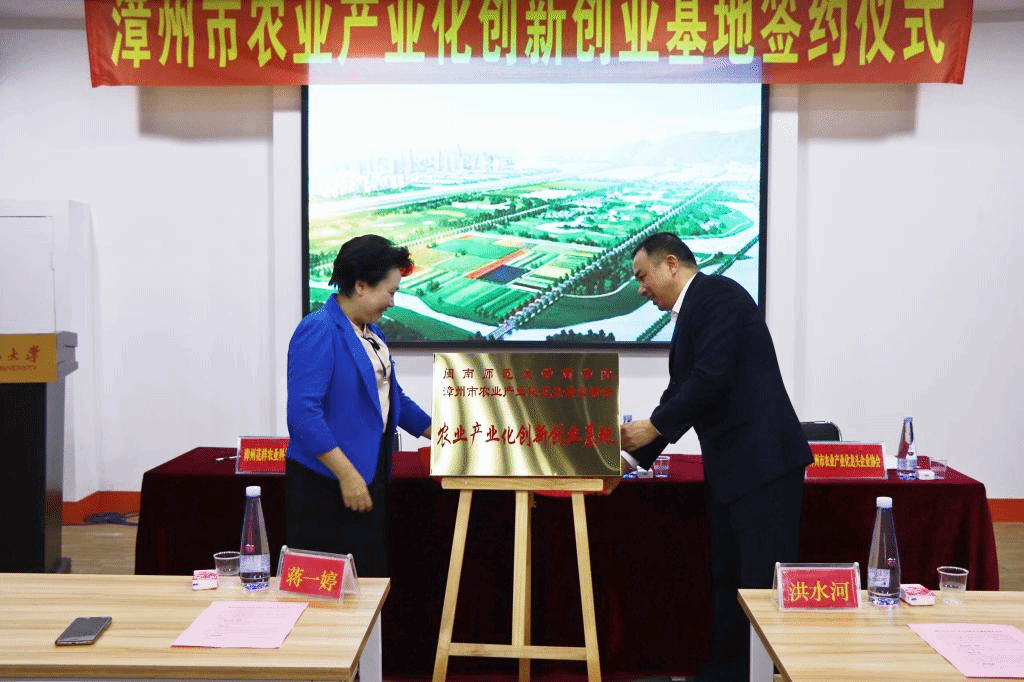 永利23411集团院长张惠萍、漳州市农业产业化龙头企业协会会长洪水河、漳州花样农业科技有限公司副总经理张国辉共同签署漳州市农业产业化创新创业基地共建协议。副校长蒋一婷、漳州市农业产业化龙头企业协会会长洪水河共同为创新创业基地揭牌。