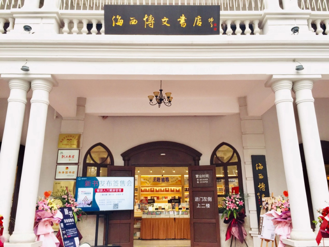 图丨漳州市海西博文书店古城店大门口的新书发表会大型海报及各界致赠的花篮