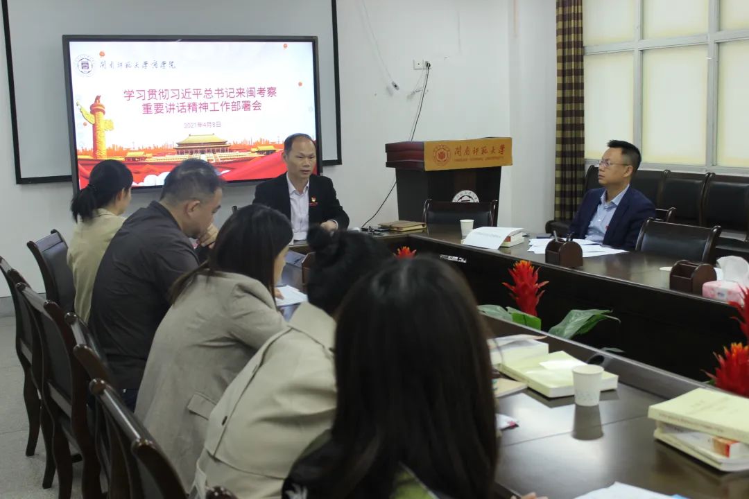 黄伟东就如何贯彻学习提出三点要求。一要深化学习领会,提高政治站位。迅速兴起学习宣传贯彻习近平总书记来闽考察重要讲话精神的热潮,切实开展多形式专题学习,确保学深悟透,入心入脑。二要强化责任担当,认真履职尽责。与深入开展党史学习教育和“再学习、再调研、再落实”活动结合起来,自觉把学习贯彻习近平总书记重要讲话精神转化为推动学院办学发展的新思路、攻坚克难的新举措。三要全面对标对表,坚持实干实效。结合学院工作实际,切实找准工作的结合点、着力点、突破口,创造性地抓好贯彻落实,全力推动学院“十四五”开好局起好步,以优异成绩迎接建党100周年。