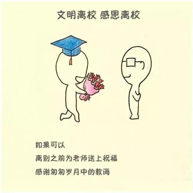 六月的天空晴朗 乘坐的“大学”号列车即将到站 风中开始弥漫着离别的味道 毕业的钟声也悠然敲响 有一群人将要告别闽南师大 踏上人生新的征程 在这里 向全体毕业生发出离校倡议 愿你们 历尽千帆 归来仍是少年 在此我们向全院毕业同学发出文明离校的倡议,为自己的大学生活留下完美的句号。 六月 即将毕业的你们 将会面对社会的洪流 清廉这一根弦 时刻要绷紧 清白做人,守住底线,永葆高尚情操。 正视权力,心存敬畏,坚守公平正义。 弘扬美德,规范言行,树牢规矩意识。 增强自律,爱岗敬业,培养职业操守。 同学们,预祝你们在新的岗位上,取得出色成绩,在生活中充满欢乐。希望你们不断提升自己,山海无惧,来日可期,在未来的舞台上绽放自己的光彩,踏着前进的曙光,迎接明日的辉煌!
