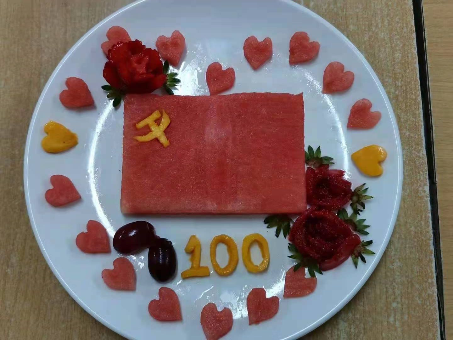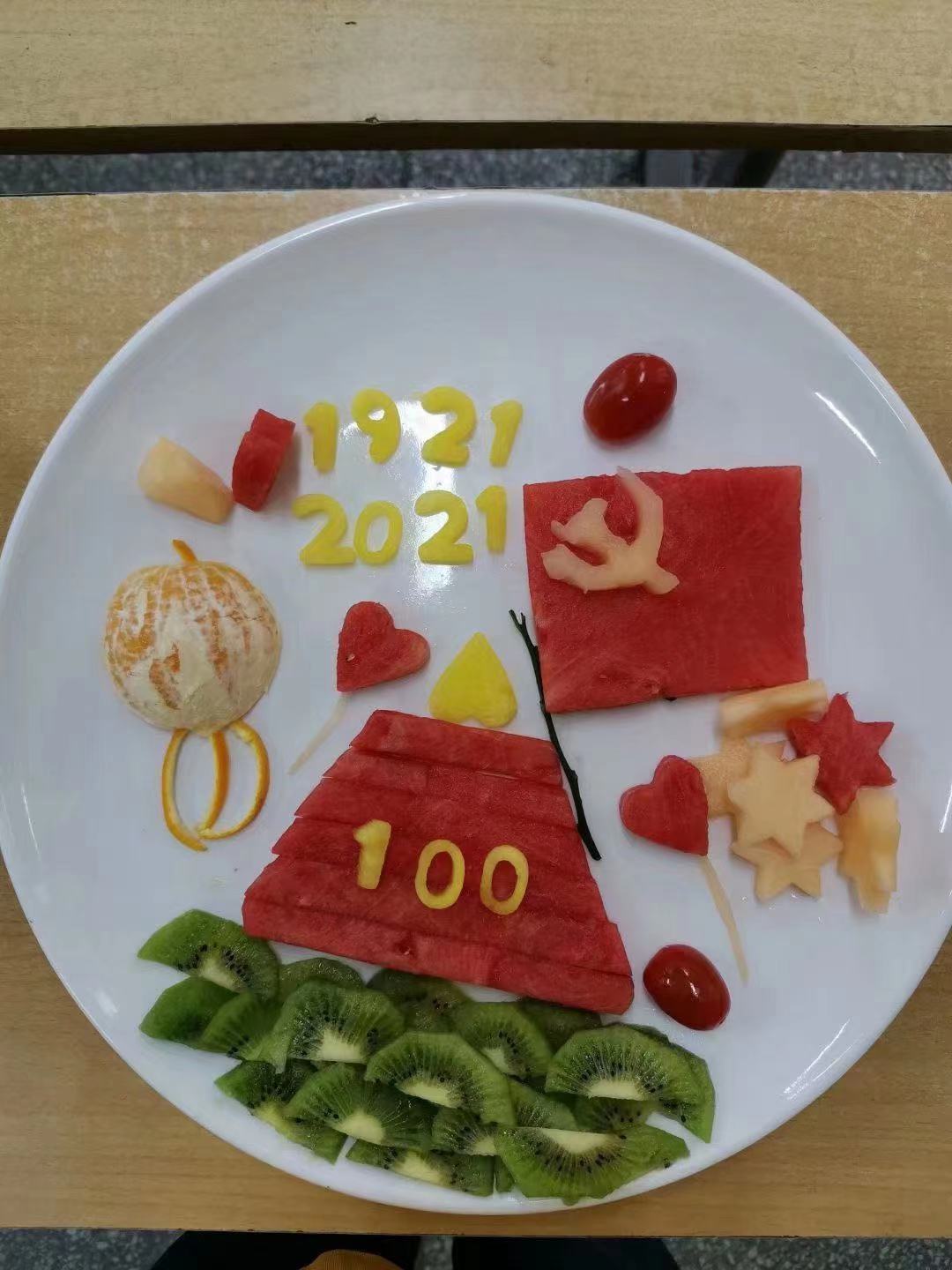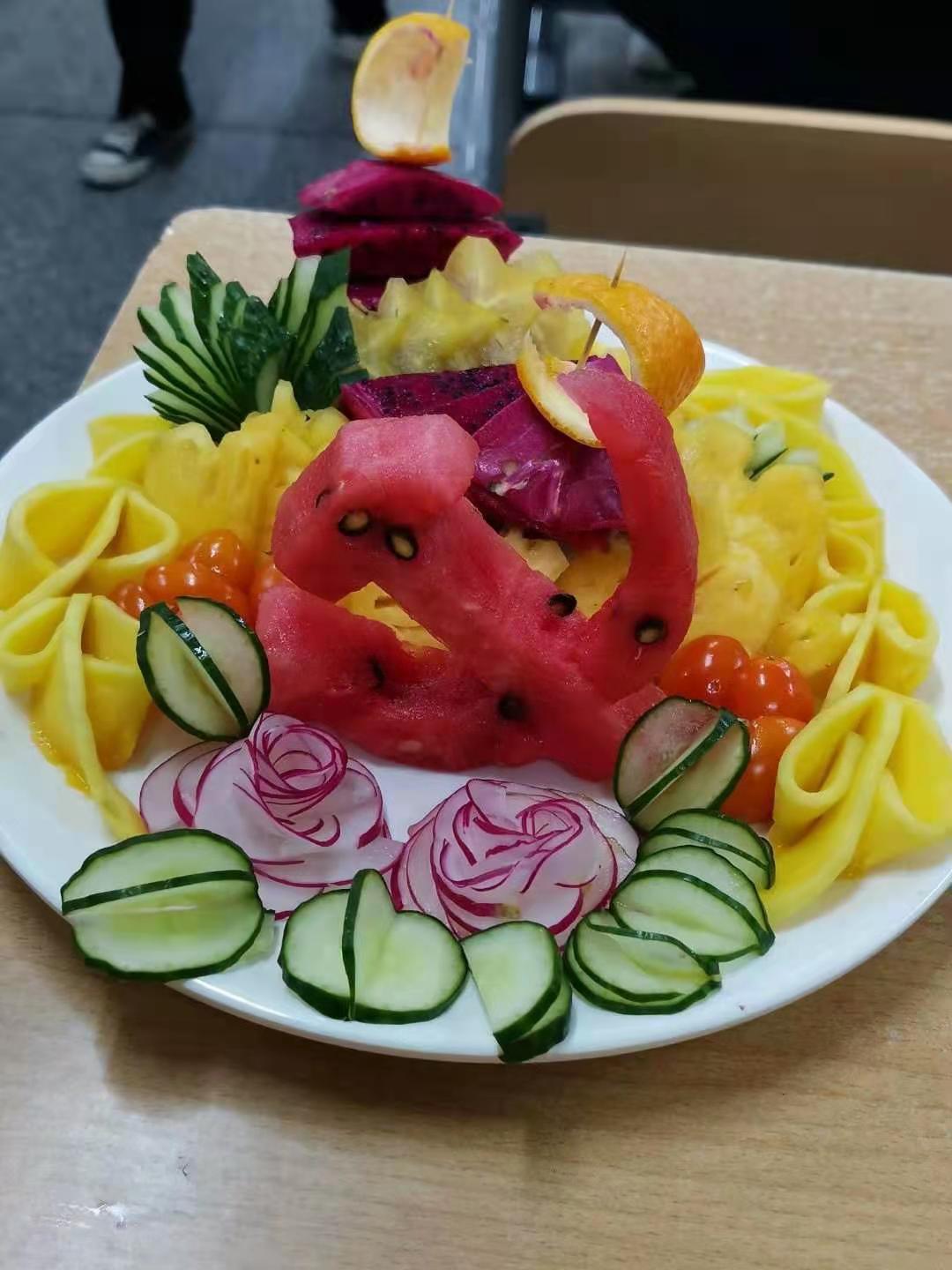 课程前期,陈老师精心准备,从旅游专业特点出发,设计出用“创意雕”献礼建党百年的教学方案,深入挖掘了酒水课程蕴含的思政元素和其所承载的育人功能。课堂上,陈老师以酒店餐饮的知识框架展开,引入当下时政热点,将理论与实践结合,组织并指导同学们进行创意雕刻的课堂小活动,同学们积极响应,各展所能,精心制作了一件件构思巧妙、设计新颖的雕刻小作品,用自己的专业劳动成果表达对建党百年和祖国强盛的衷心祝福。
