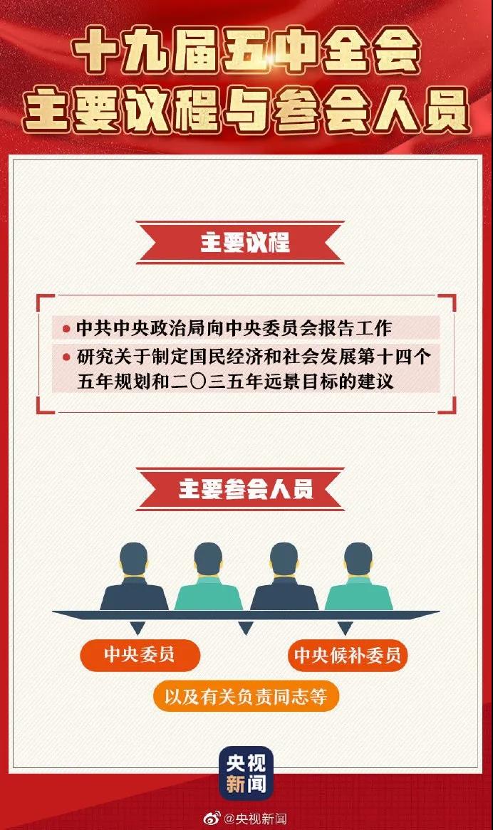 中国共产党第十九届中央委员会第五次全体会议,于10月26日至29日在北京举行。主要议程是,中共中央政治局向中央委员会报告工作,研究关于制定国民经济和社会发展第十四个五年规划和二〇三五年远景目标的建议。今天,一组图带你了解十九届五中全会。