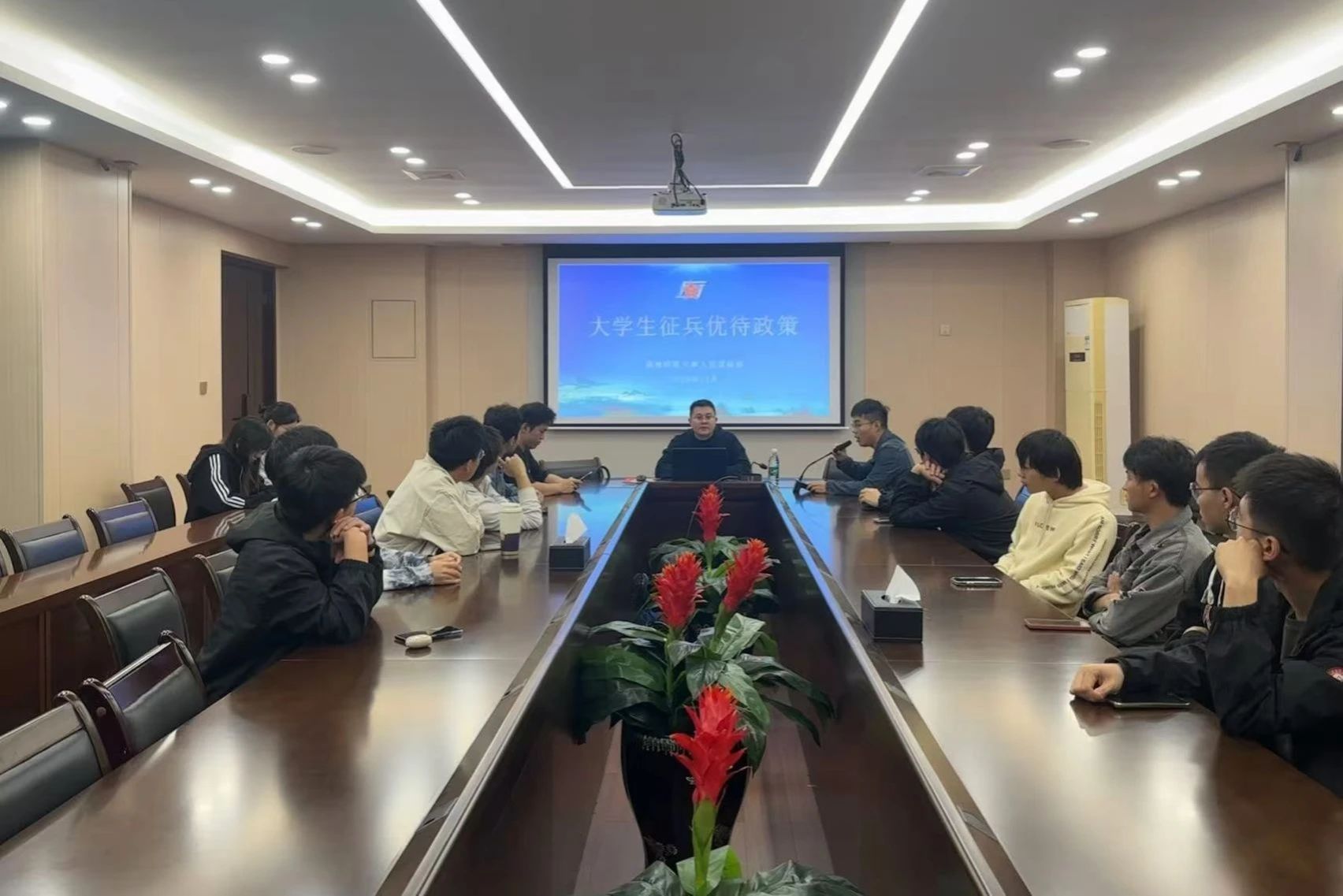 会议伊始,蔡志桥全面阐述了优先征集入伍、保留入学资格、享受国家资助等针对大学生的入伍优惠政策。同时,他也对异地应征的相关注意事项及退伍后在创新创业方面所享有的优待等内容进行解读,进一步展现了国家对大学生入伍的大力支持。蔡志桥表示,希望以此激励大家积极报名应征,响应国家号召,勇敢接过祖国赋予的责任。