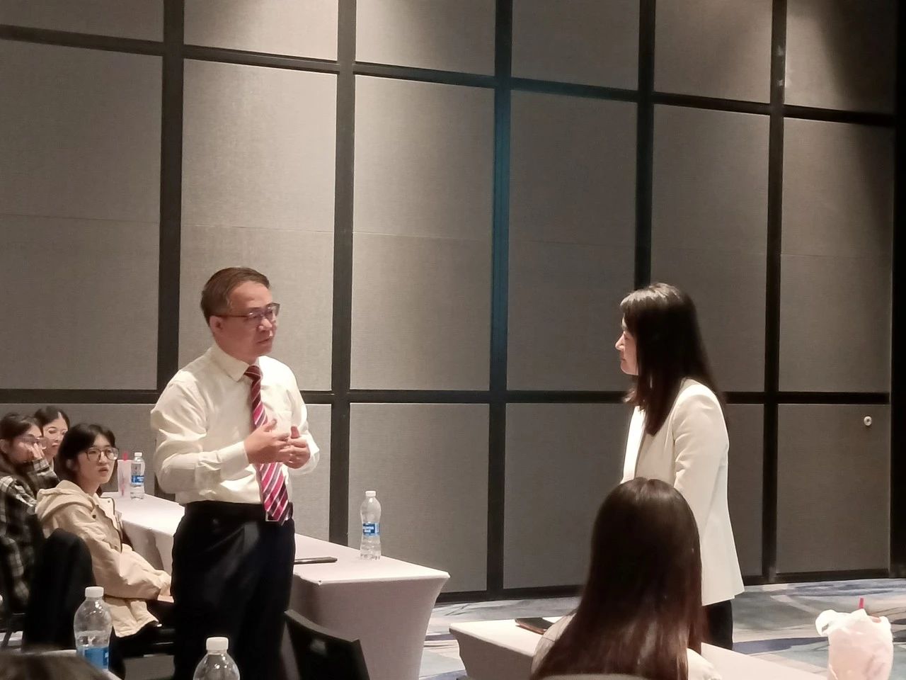 参观结束后,人力资源部总监张璇与同学们亲切交谈。在提问环节,张璇总监及朱虹经理耐心解答同学们的问题,帮助同学们了解万豪酒店及会议中心的特色文化,并为同学们传授面试经验。