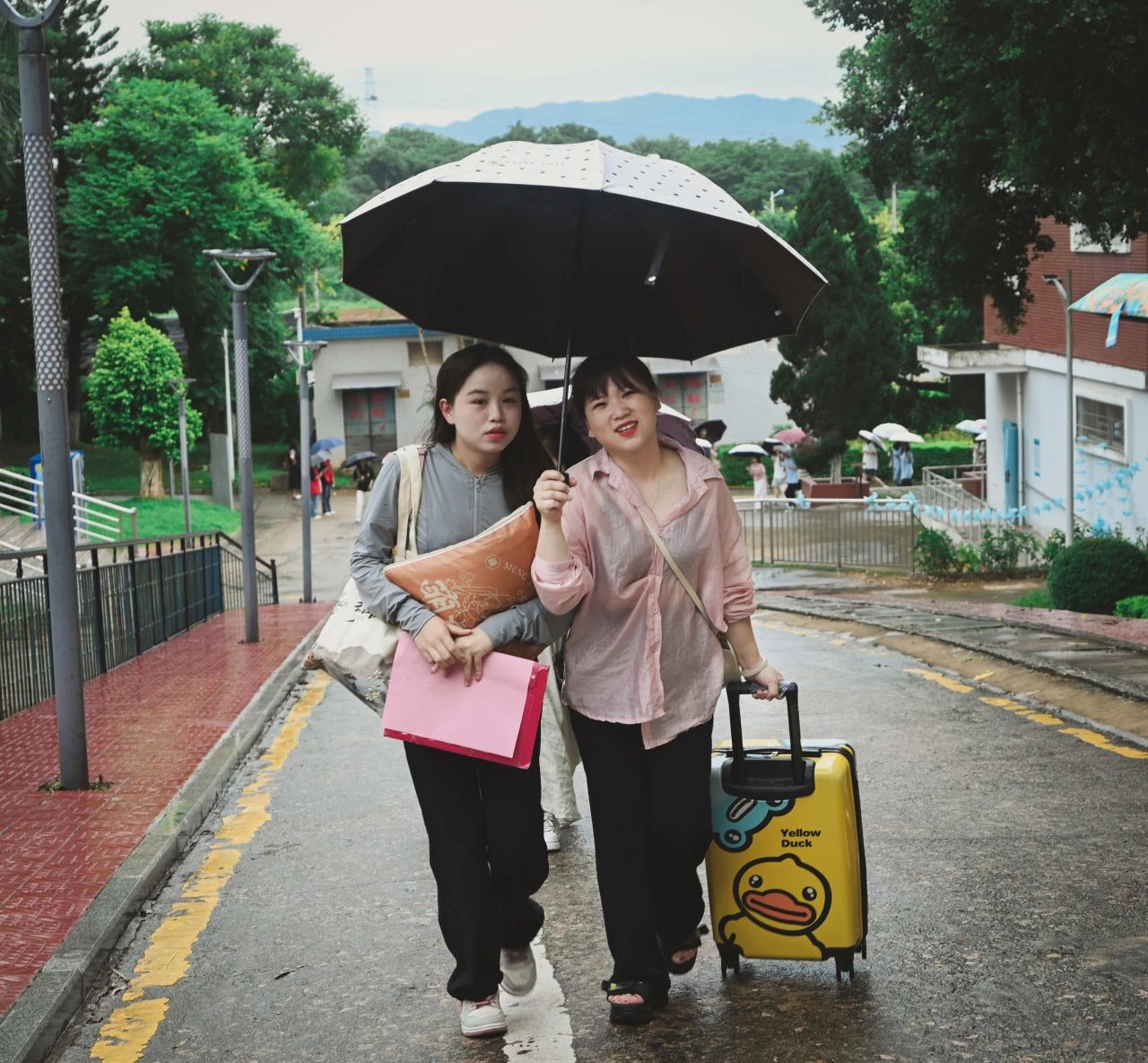 林荫道路,雨丝风片,阵阵秋雨却浇不灭迎新的热情。新生们在家长们陪同下陆续到达校园接引处,志愿者们接过新生们的行囊,红色的马甲构成大雨中一道道靓丽的风景线。2023级新生们即将告别父母,在圆山开启一段崭新的旅程。