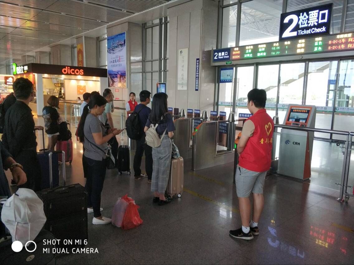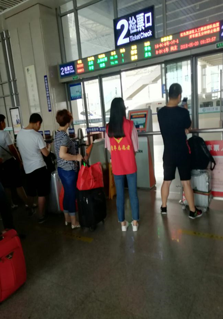 在熙熙攘攘的人群中,随时可见身穿红马甲的青年志愿者穿梭人潮,为动车站的乘客提供着各种便利服务。志愿者们各司其职,认真做好自己的本职工作,为乘客提供服务,他们用热情周到的志愿服务态度,帮助来往的乘客取票换票,为在拥挤人流中的乘客指引正确的方向。在乘客进站用过安检时,志愿者们默默地帮乘客们整理行李、维持秩序等,他们对往来的人们提供自己力所能及的帮助及便利,让乘客在疲劳旅途中感受到一丝丝温暖,能有有一个轻松愉快的旅程。