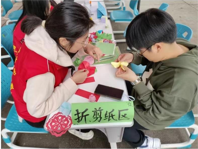折纸与剪纸小活动不仅吸引了同学们的兴趣,还增加了活动的趣味性,丰富了形式的多样化。志愿者们热情教学,在增添了互动性的同时也让同学们在活动中收获喜悦。