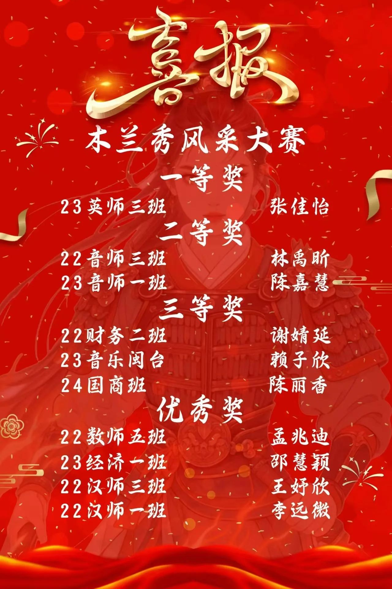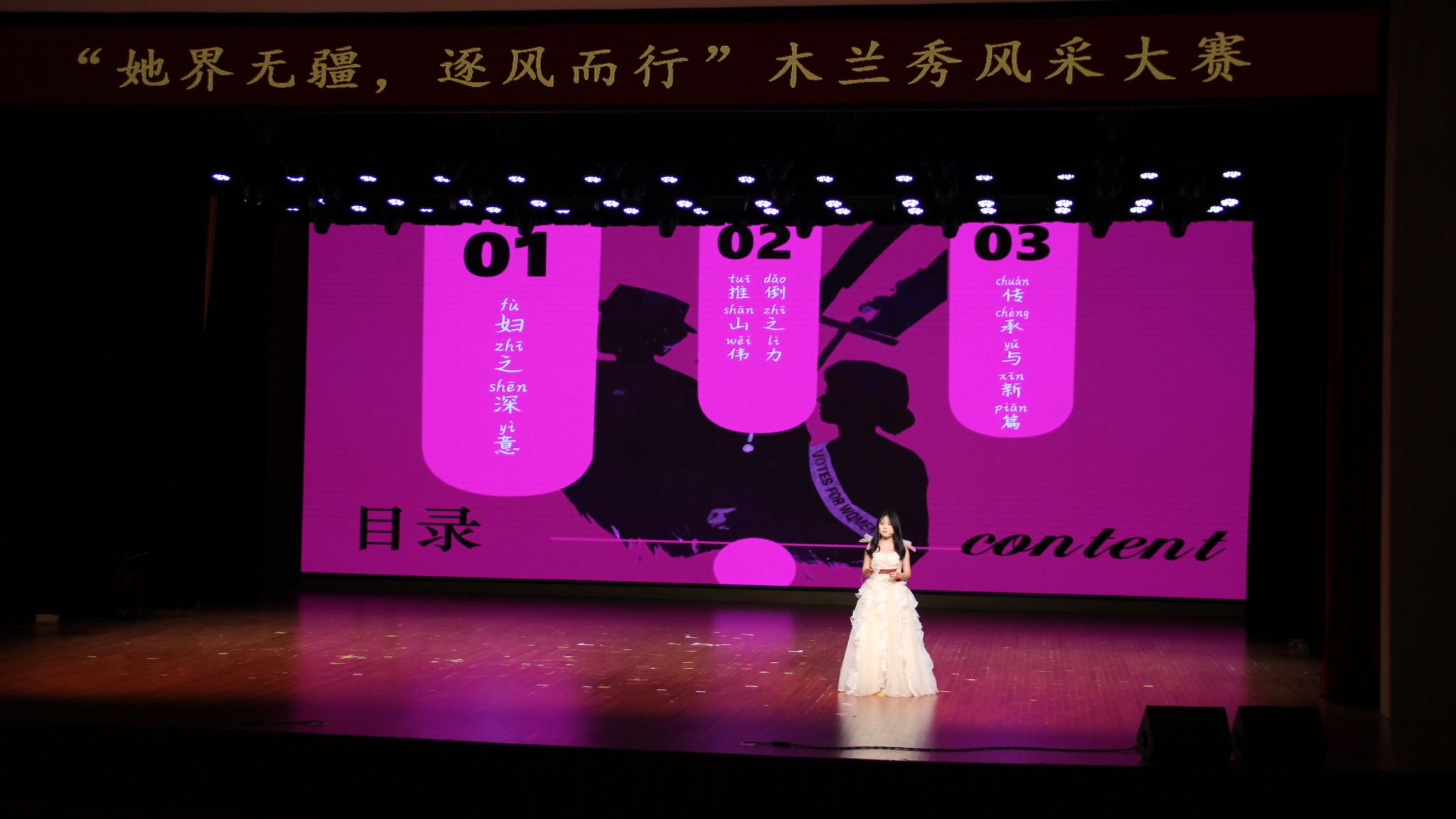 参赛选手们皆怀木兰之志,展非凡之姿,从声情并茂的主题演讲到才华横溢的才艺展示,每一幕都让人印象深刻,每一刻都闪耀着女性独有的光芒。经过评委老师们的严格评审,最终的比赛结果已经揭晓!