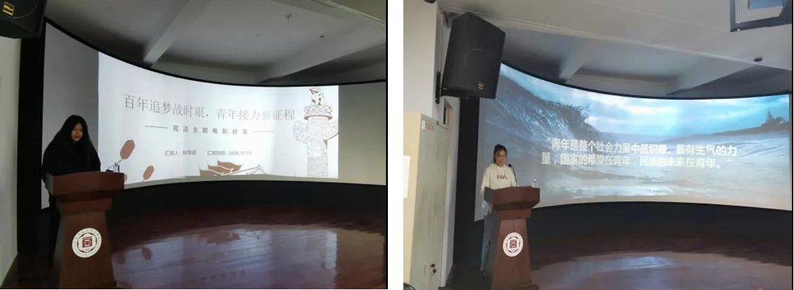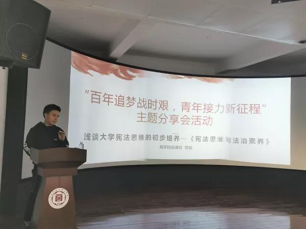 分享会上,青年志愿者中心林炜润同学分享了电影《黄克功案件》观后感。她介绍了故事背景、主要人物和内容,分享了她的观影心得。自律会邹能同学推荐了书籍《宪法思维与法治素养》,他就书中的四种思维具体介绍此书的第八章,分享了他推荐此书的理由和自己的读后感悟。职业发展中心黄佳微同学以一则新闻引入,说明守护宪法是公民的基本权利和义务,联系宪法内容阐述近日热点事件蚂蚁金服暂缓上市的原因,最后以“250定律”和“墨菲定律”结尾,鼓励同学们争当宪法的守护者、传承者,用微小的影响力影响他人乃至社会。