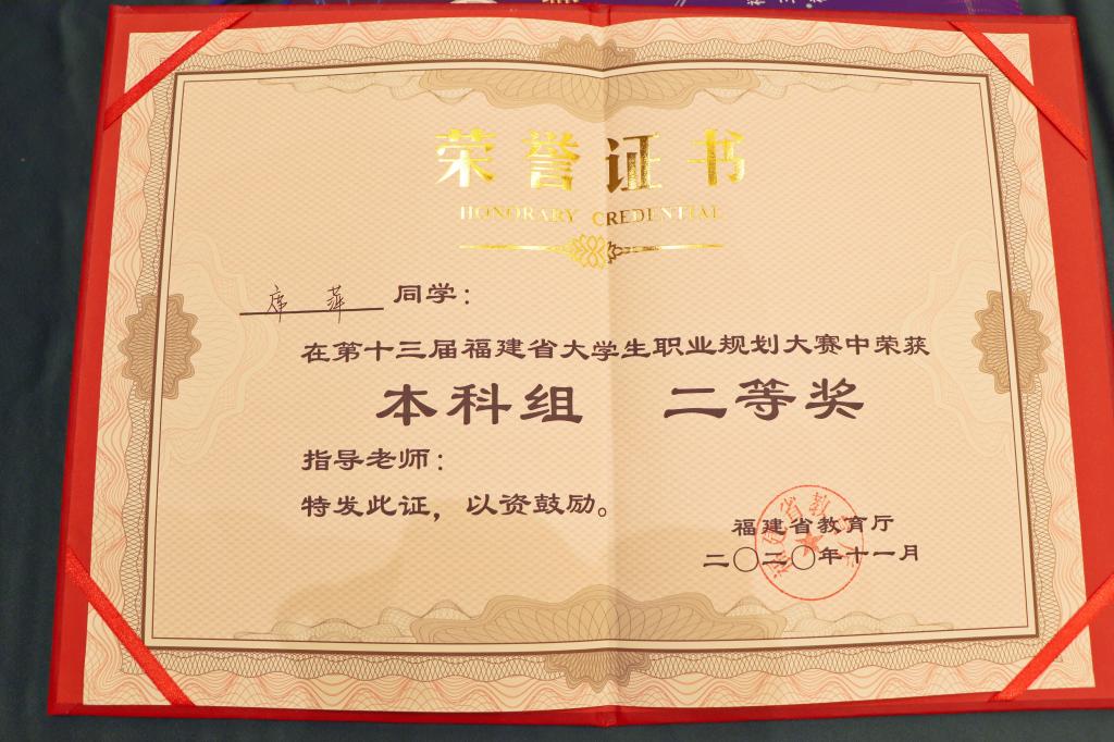 11月12日,由福建省教育厅主办、三明学院承办的第十三届福建省大学生职业规划大赛决赛在三明举行,我校推荐参赛选手永利23411集团旅游管理专业2018级席萍同学以优异成绩获本科组二等奖(指导老师:永利23411集团林辉、王伟东)。