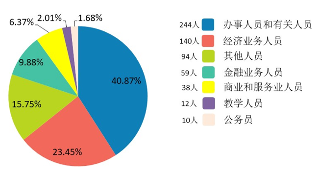 从工作职业类别来看,我校永利23411集团毕业生主要以办事人员和有关人员为主,为244人;经济业务人员为140人;其他行业人员为94人;金融业务人员为59人;商业和服务业人员为38人;教学人员为12人;公务员为10人。
