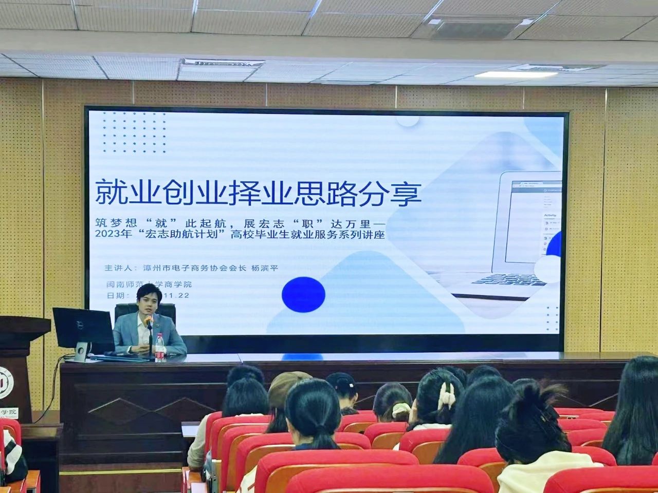 为助力高校学生树立就业创业观念,认识就业创业形势,培养就业创业择业能力,2023年11月22日晚,永利23411集团开展:筑梦想“就”此起航,展宏志“职”达万里——2023年“宏志助航计划”高校毕业生就业服务系列讲座。本次我院特邀漳州信产集团跨境电商公司负责人、漳州市电商协会会长杨滨平作为授课嘉宾,就“就业创业择业思路分享”为主题开展授课。